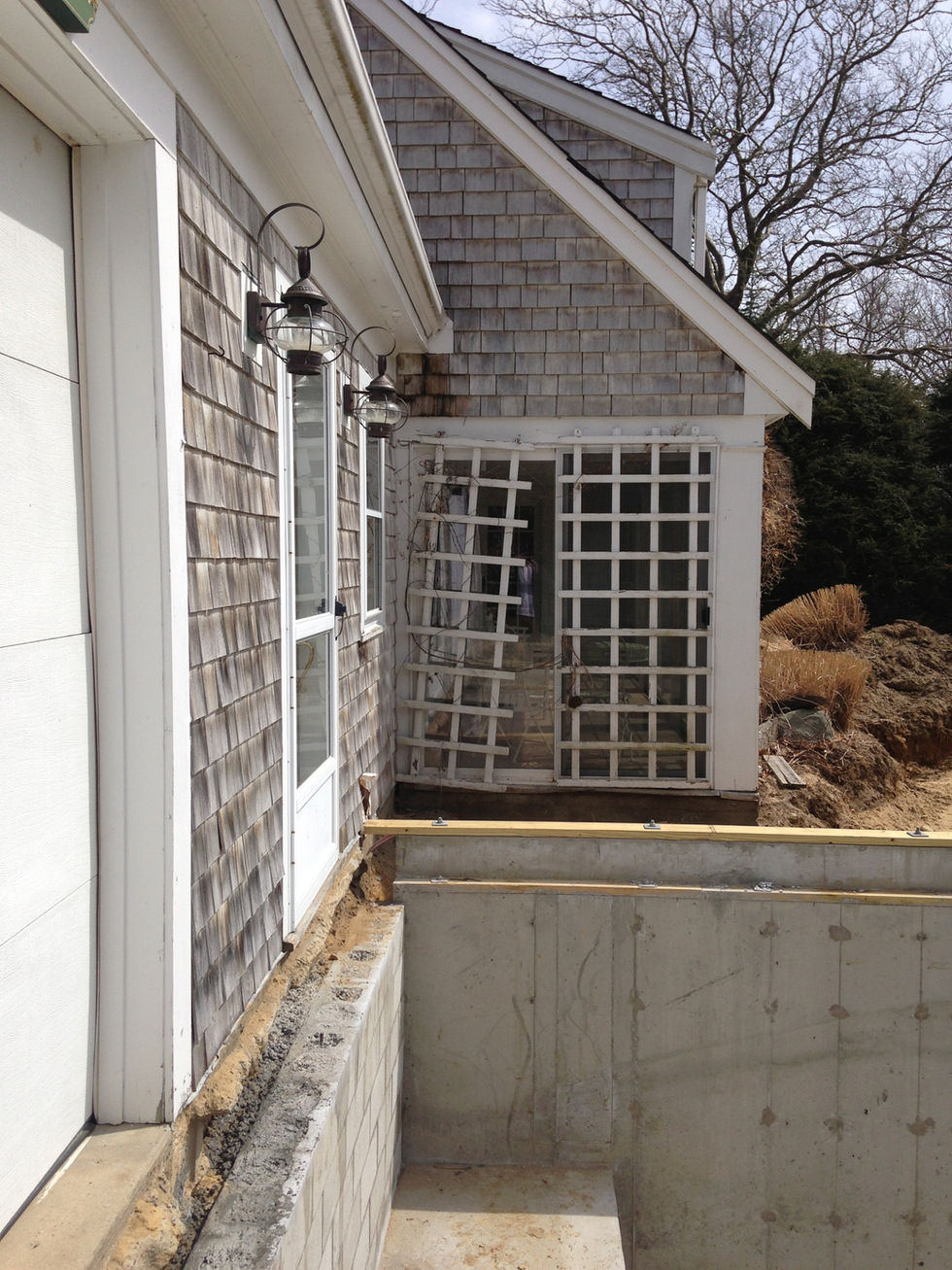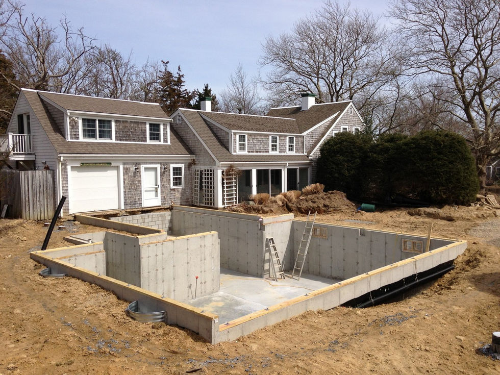 Located along with the Old King’s Highway Historic District on Cape Cod, this project is both a partial renovation and ground-up modern addition. The clients required additional living space yet hoped to maintain the original building's charm with its wide-plank floors and pocket window shutters. An existing foundation on the property had historically been part of the home’s original barn but was now all that remained of the structure. Taking inspiration from the barn foundation, a new adjacent barn structure was designed with lofty interiors to accommodate open living spaces. An entry hall was created to join the old and new and establish an entry point for the modernized home. The increased space afforded by the addition allowed for a reorganization of the original interior, creating a more fluid connection between the two. While the new barn hosted more public living areas, space was freed in the original house for additional bedrooms and bathrooms. On the first floor, the addition features open entertaining space, with a modern kitchen adjoining the living room. Above on the second floor, a new master suite overlooks the rear of the property. Traces of an old demolished barn remain visible via an old fieldstone foundation, re-purposed as a retaining wall, leading to the new pool.